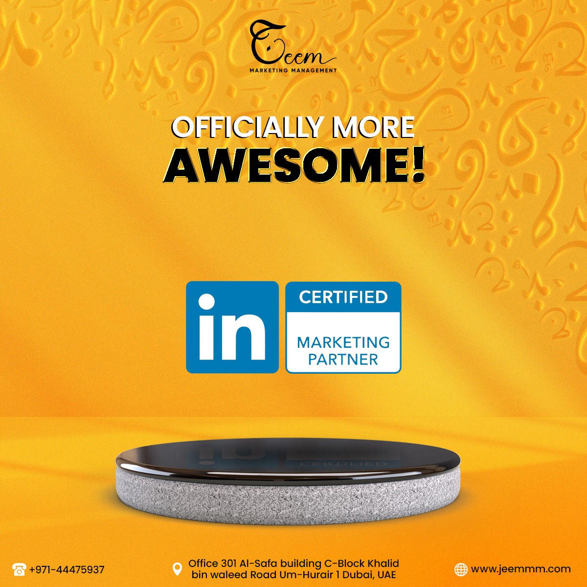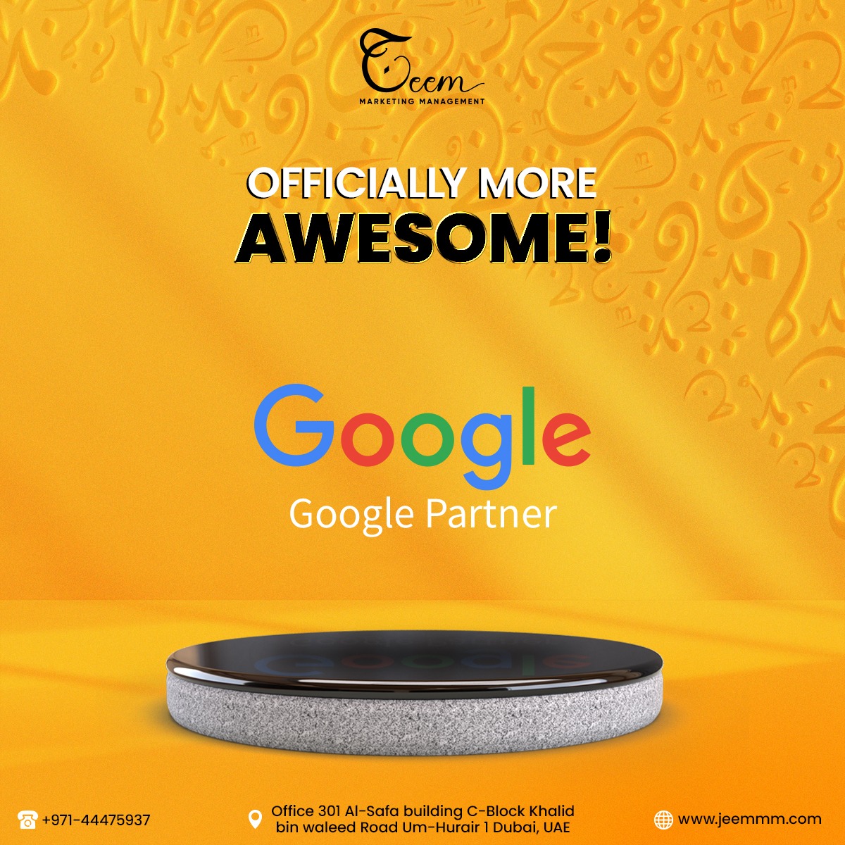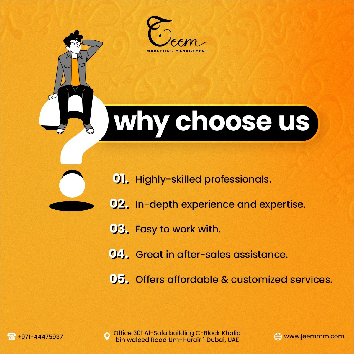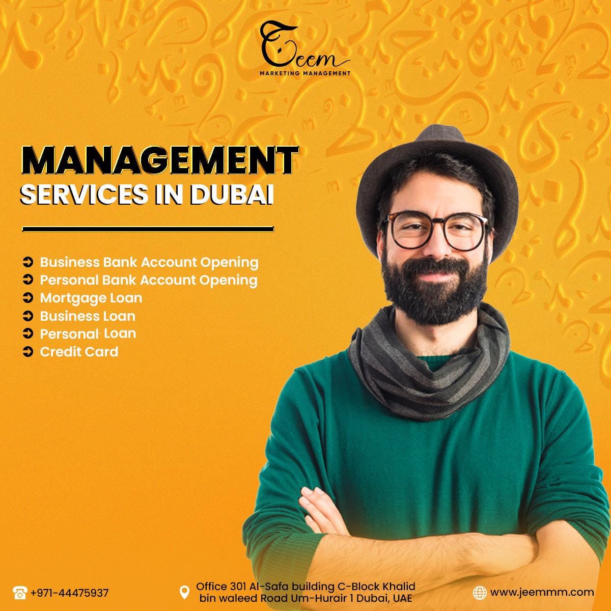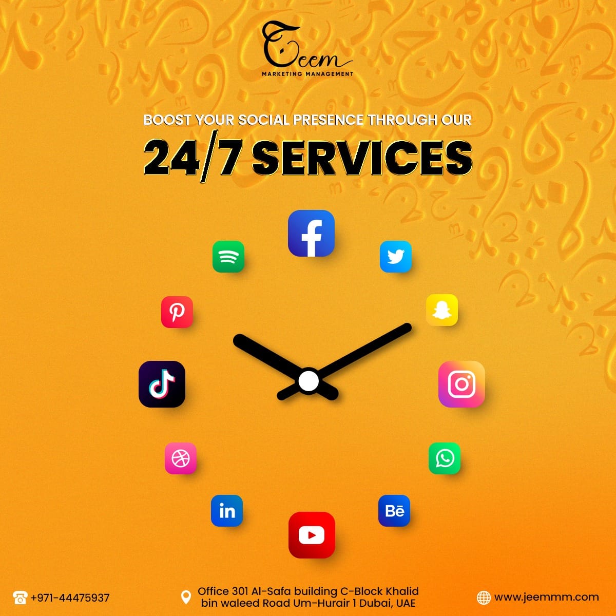 "Jeem Marketing Management is a name of excellence in the UAE digital world. As a top-tier Digital Marketing Agency in Dubai, we deliver customized solutions to promote your brand's online presence.Our extensive services include content and influencer marketing, branding and strategy, graphic design, website development, SEO, & more.